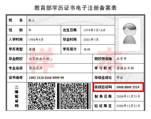 4)前置专科或本科学历的“教育部学历证书电子注册备案表”(从中国高等教育学生信息网:http://www.chsi.com.cn上查询),(或者提供“中国高等教育学历认证报告”原件及复印件一份, 这2种认证方式提供任何一种即可)。《教育部学历证书电子注册备案表》、或《中国高等教育学历认证报告》式样见图1、图2(图1或图2,提供任何一份均可);