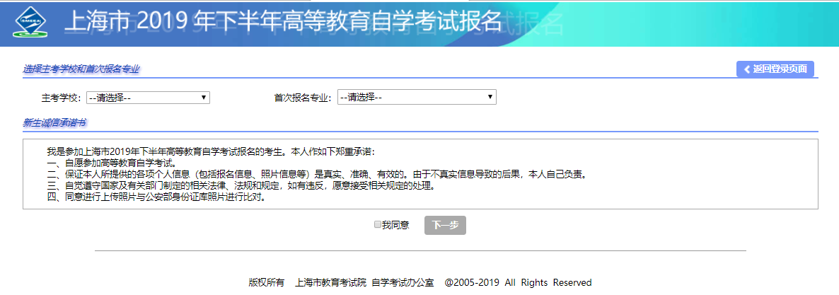 选择您要报考的主考学校和首次报名专业,并仔细阅读考生诚信承诺书,最下方是主考学校的温馨提示,请仔细阅读后,再决定是否报考。选择我同意后点击下一步,进入填写个人信息界面。