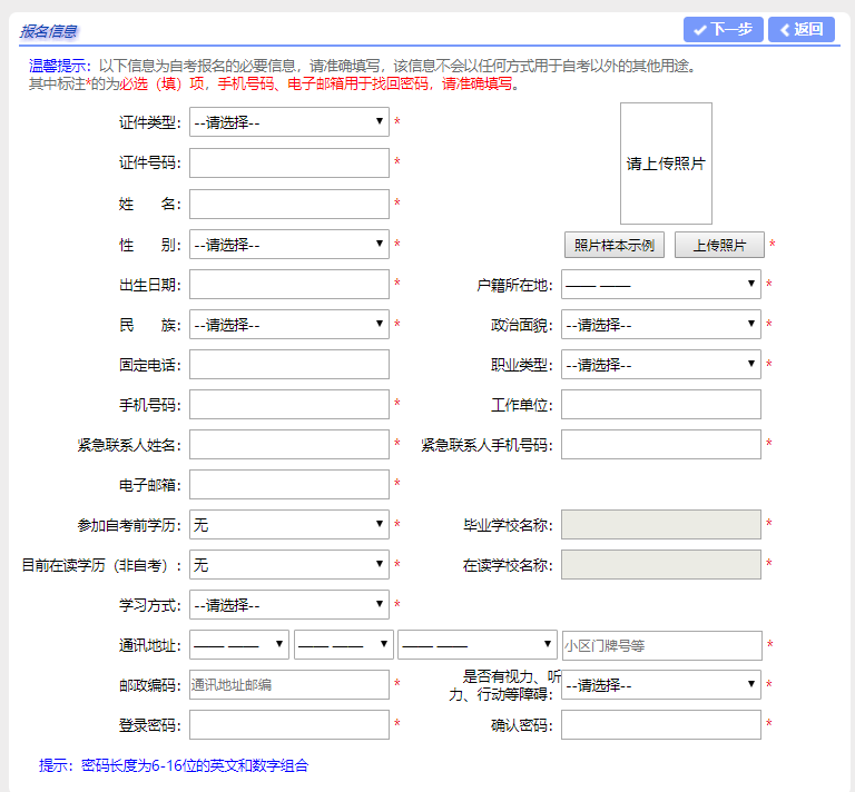 考生登录以后,请先完善个人信息,下一步后可以看到如下图的报名信息。