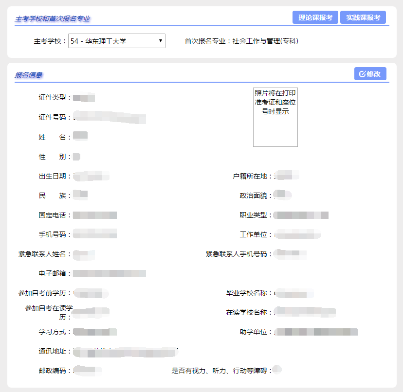 点击修改按钮,可以修改报名信息。(在籍考生不能修改关键信息)