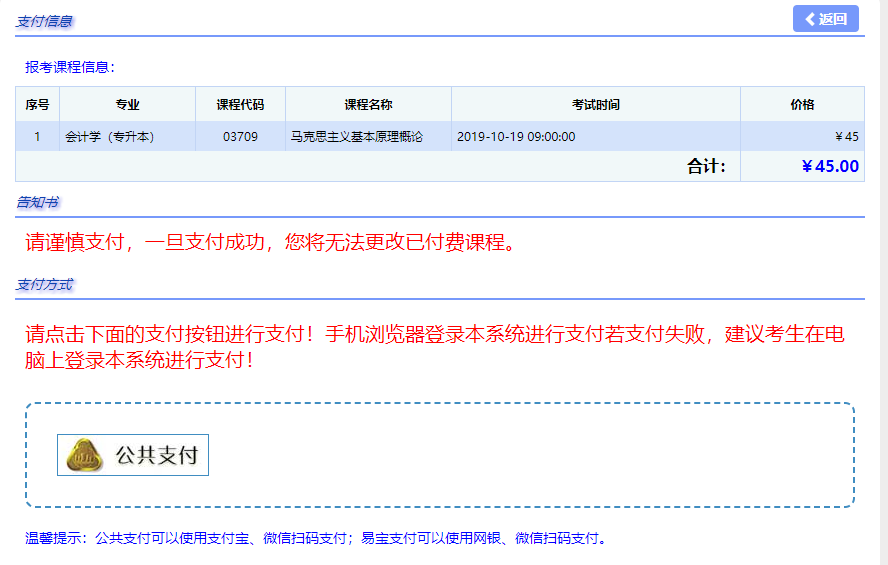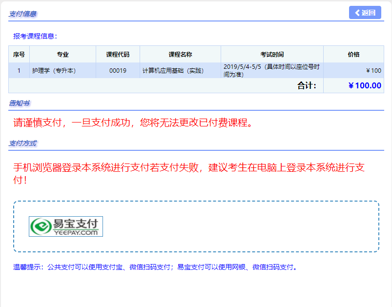 (3)课程费用支付(公共支付和易宝支付,其中理论课报考使用公共支付,实践课报考使用易宝支付)