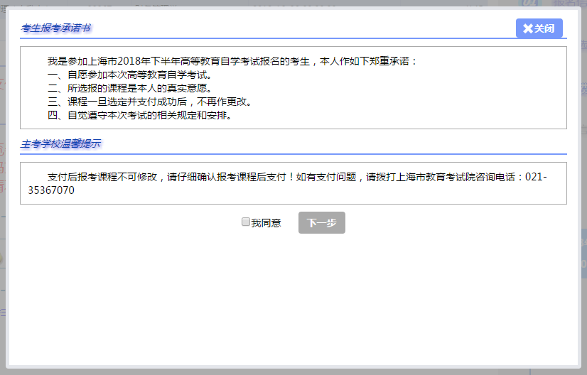 点击支付方式之后,会弹出考生报考承诺书,请仔细阅读,选择我同意后点击下一步进行课程费用支付。