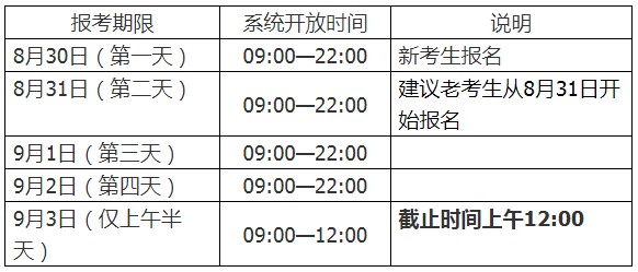 为防止网络拥堵,建议老考生从8月31日开始报考。