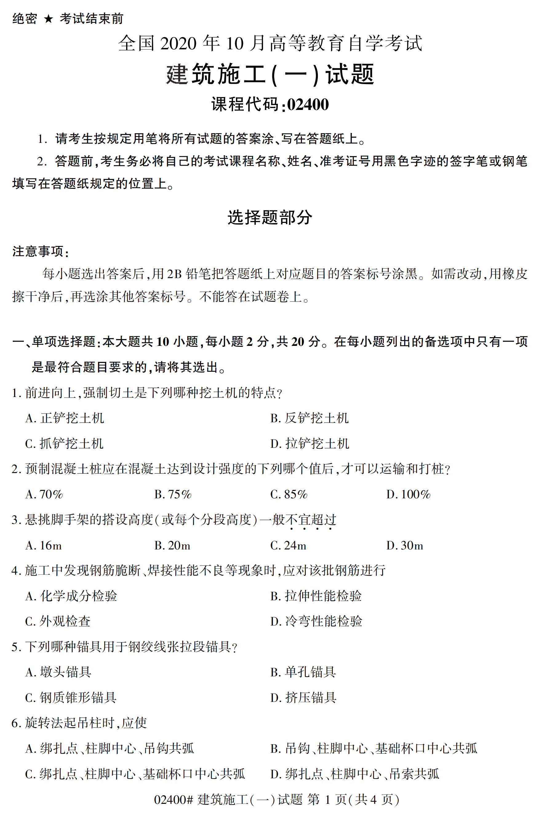 全国2020年10月自考02400建筑施工(一)试题