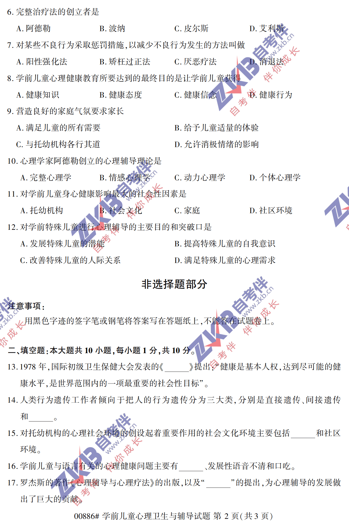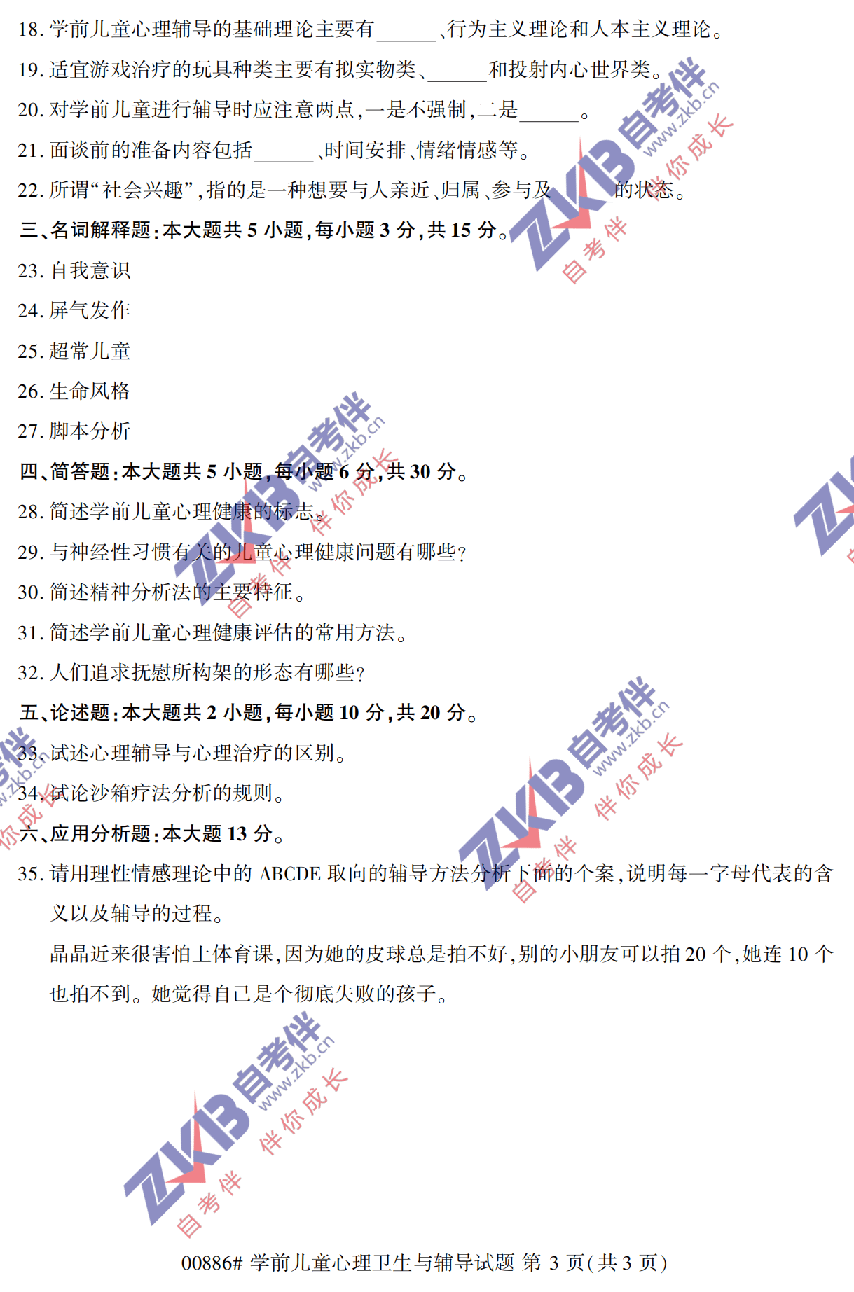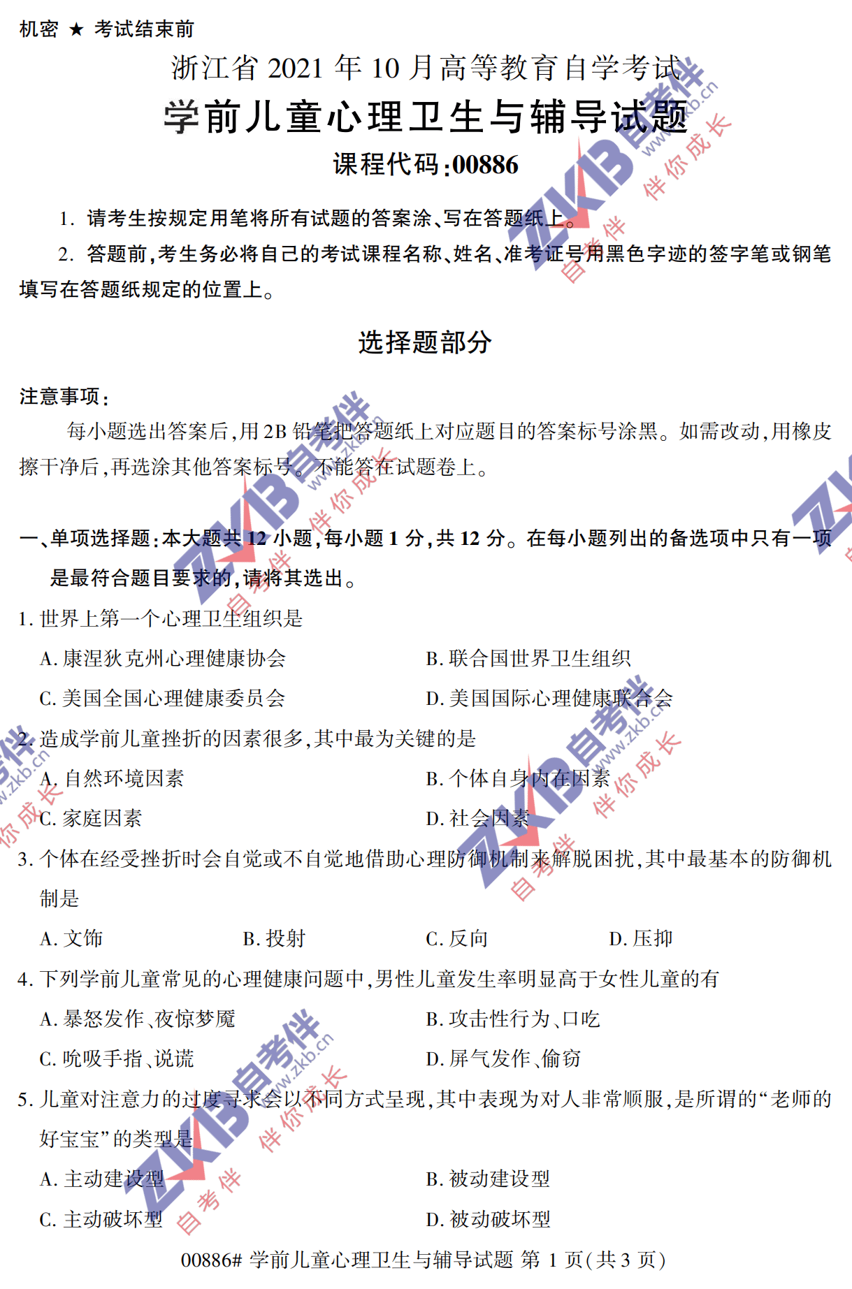 2021年10月上海自考00886学前儿童心理卫生与辅导真题试卷