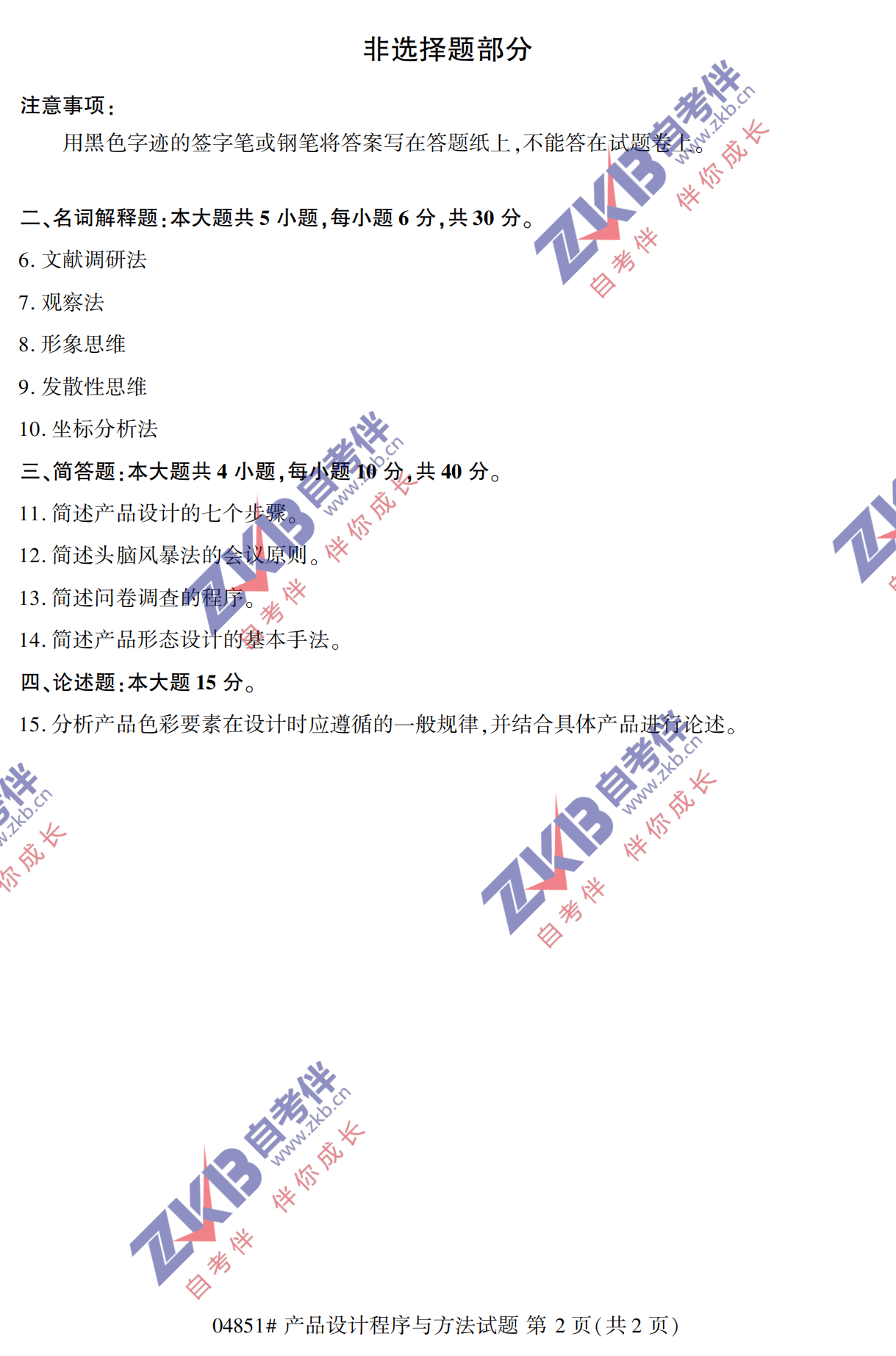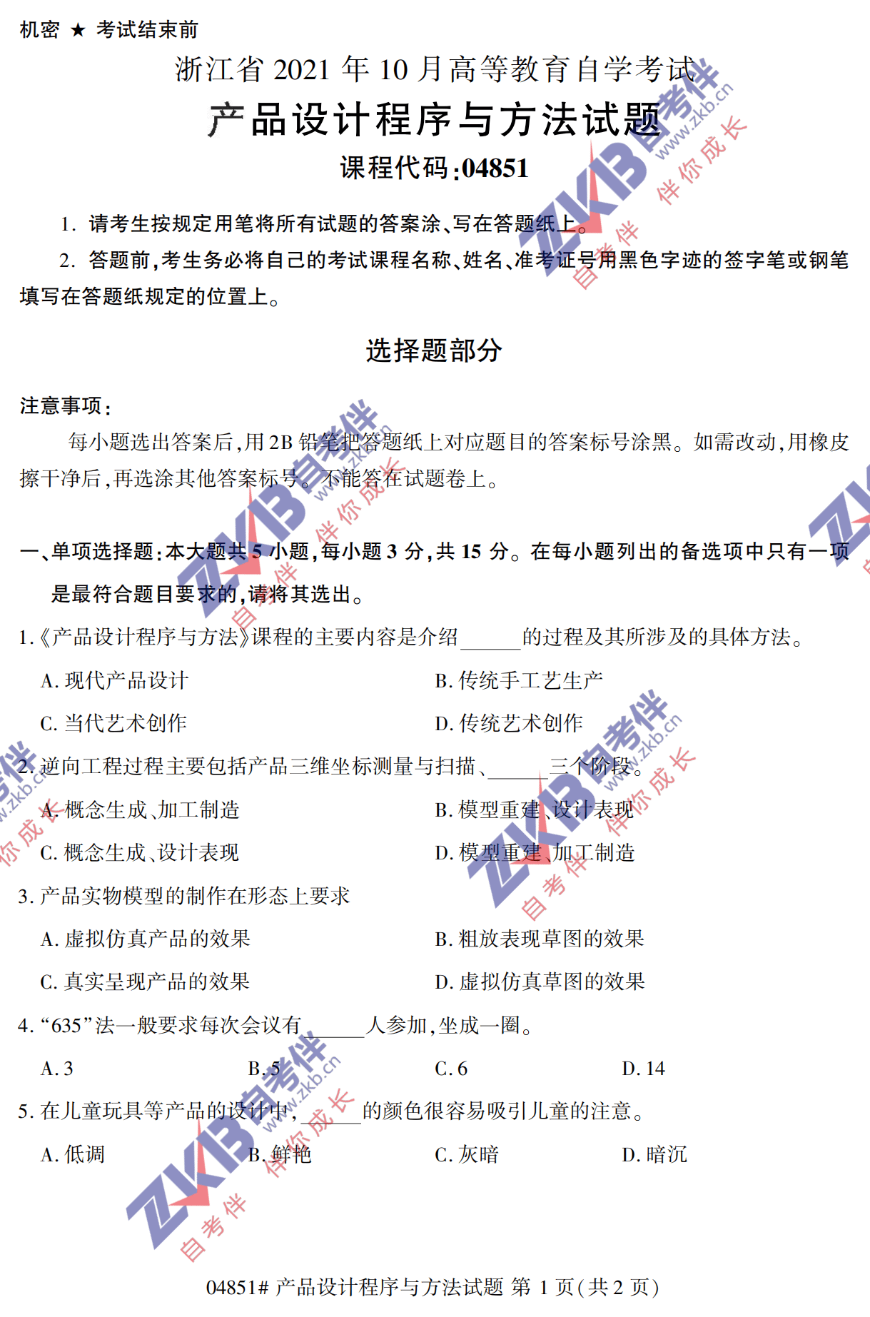 2021年10月上海自考04851产品设计程序与方法真题试卷