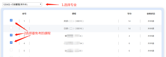 特别提醒:可以一次勾选多门课程提交免考申请。
