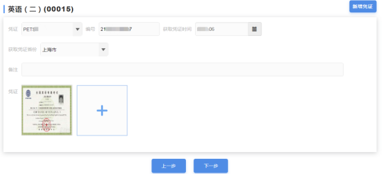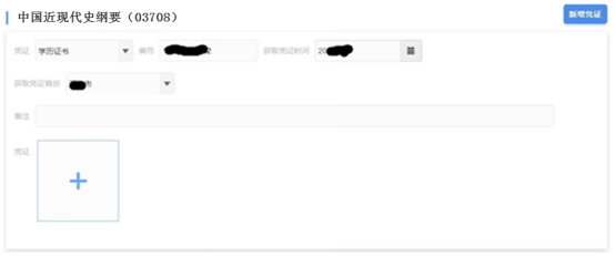 新增凭证:点击“新增凭证”,可以添加多张凭证信息,用于一门课程同时需要多种凭证的场景,例如使用毕业证书免考时,应使用“新增凭证”功能增加“电子注册备案表”或“教育部学历认证报告”。
