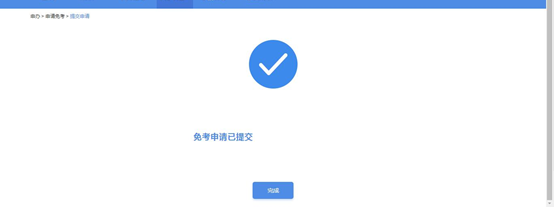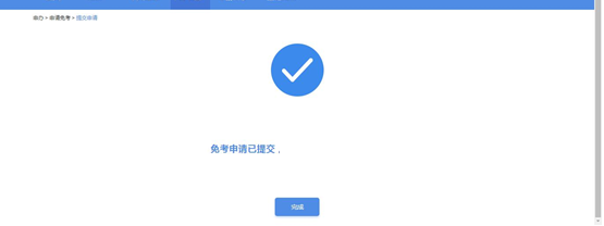 提交成功后,注意查看提示文字。点击“完成”返回申请免考界面,可以看到当前审核结果为待审核。(注:如提交后发现有误,可在待审核状态时修改并重新提交)