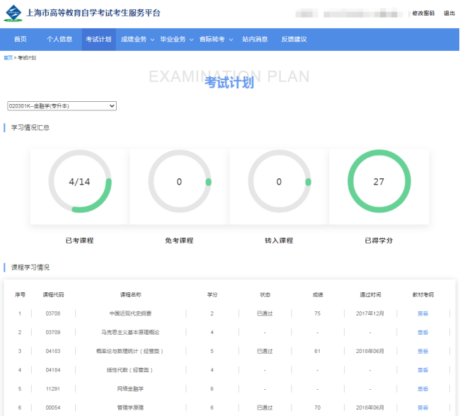 点击“考试计划”,考生可查看自己本专业的课程学习情况,如下图所示: