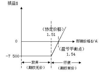 (3-2)当即期外汇市场价格=$1.52/£,高于协定价格,行使期权,有损失,损失低于期权费$7500。计算如下: