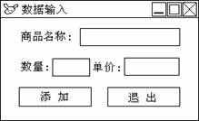 2、功能是单击“添加”按钮,将表单输入数据添加到数据表中,其中:金额=数量*单价,单击“退出”按钮,结束程序运行。