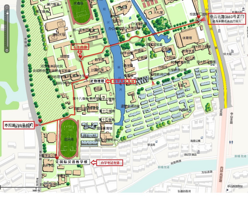 本次考试在我校“国际汉语教学楼”(原师大二附中)和“老物理楼”设有考场,方位大致如下图所示:
