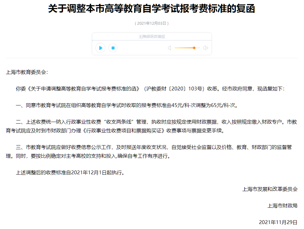 一、上海市教育考试院在组织高等教育自学考试时收取的报考费标准由45元/科·次调整为65元/科·次。