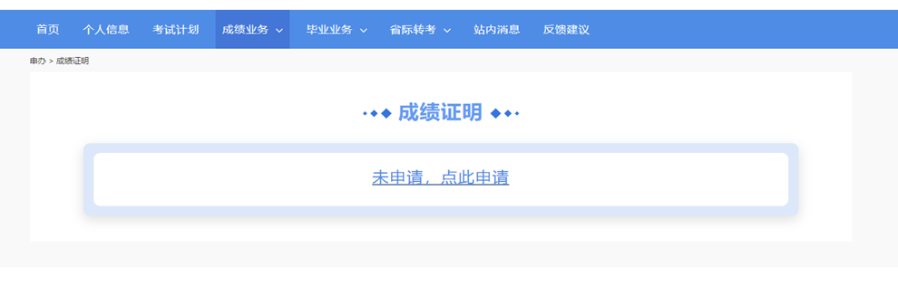凡参加上海市高等教育自学考试,已取得一门及以上合格成绩且未毕业的考生,可以登录“考生服务平台”,点击顶部菜单【成绩业务】栏下的【成绩证明】栏目,点击页面中“未申请,点此申请”链接(如下图所示)进入申请成绩证明页面。