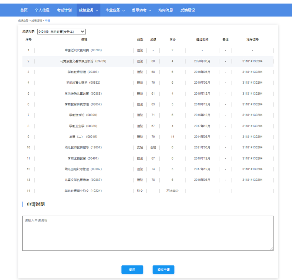 成绩证明申请页面:显示考生所选择的专业和该专业所有的合格成绩,并填写申请说明,如下图所示: