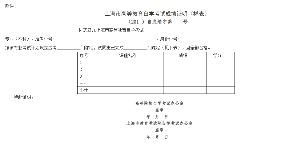 上海市高等教育自学考试成绩证明(需主考院校盖章确认,格式见附件)。