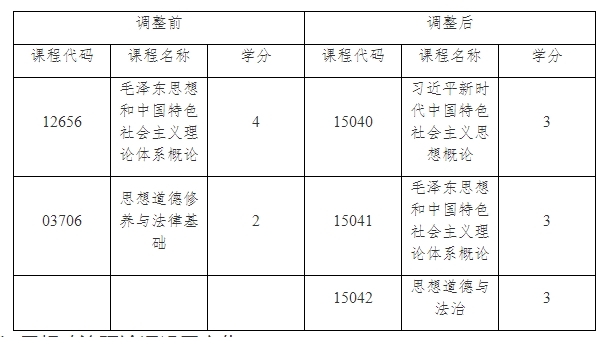 一、调整后高等教育自学考试本专科层次专业的思想政治理论课均设置3门课程,共9学分,调整前后的变化如表所示。