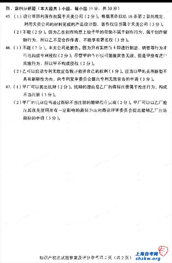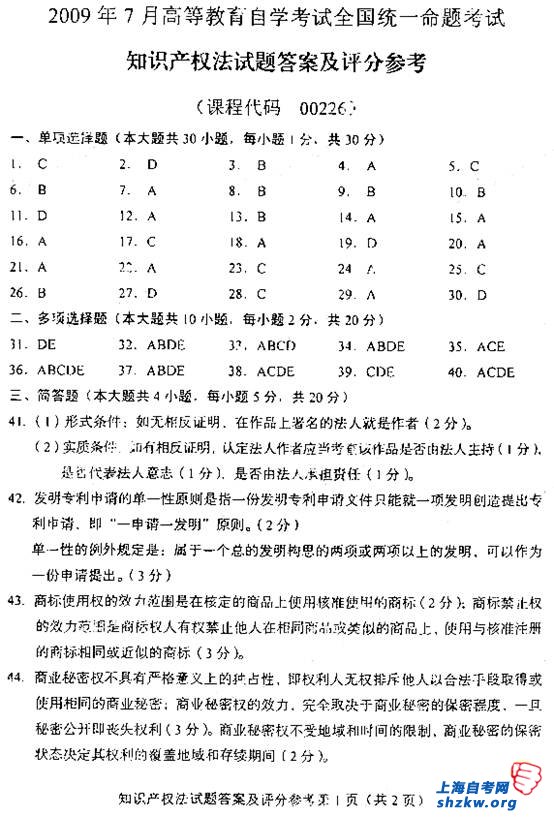 全国2009年7月自考00226知识产权法试题答案(上海自考)