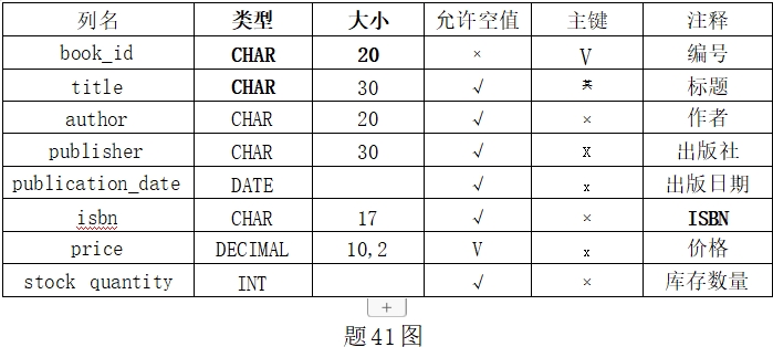 41. 图书信息表(book)的结构如题41 图所示,请编写 SQL 语句完成下列操作:
