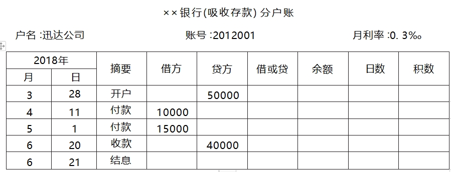 要求 :在账页上计息并编制转存利息的会计分录 。【考生按上表格式抄写在答题卡(纸) 上作答】