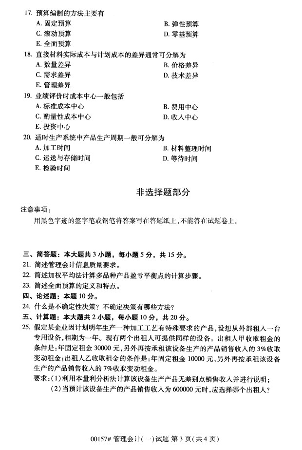 全国2019年10月自考00157管理会计(一)试题