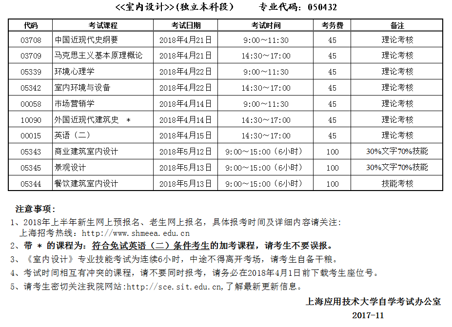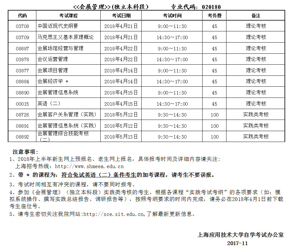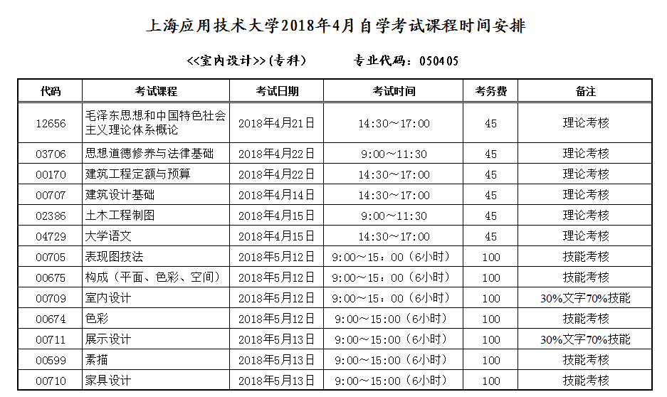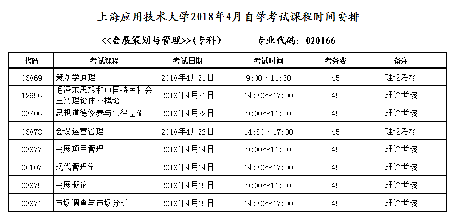 【上海应用技术大学】2018年4月自学考试课程时间安排